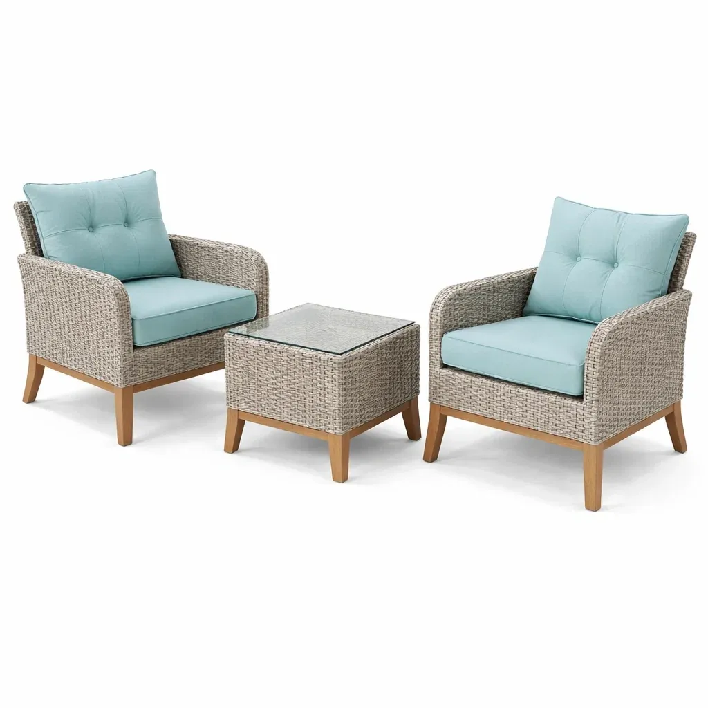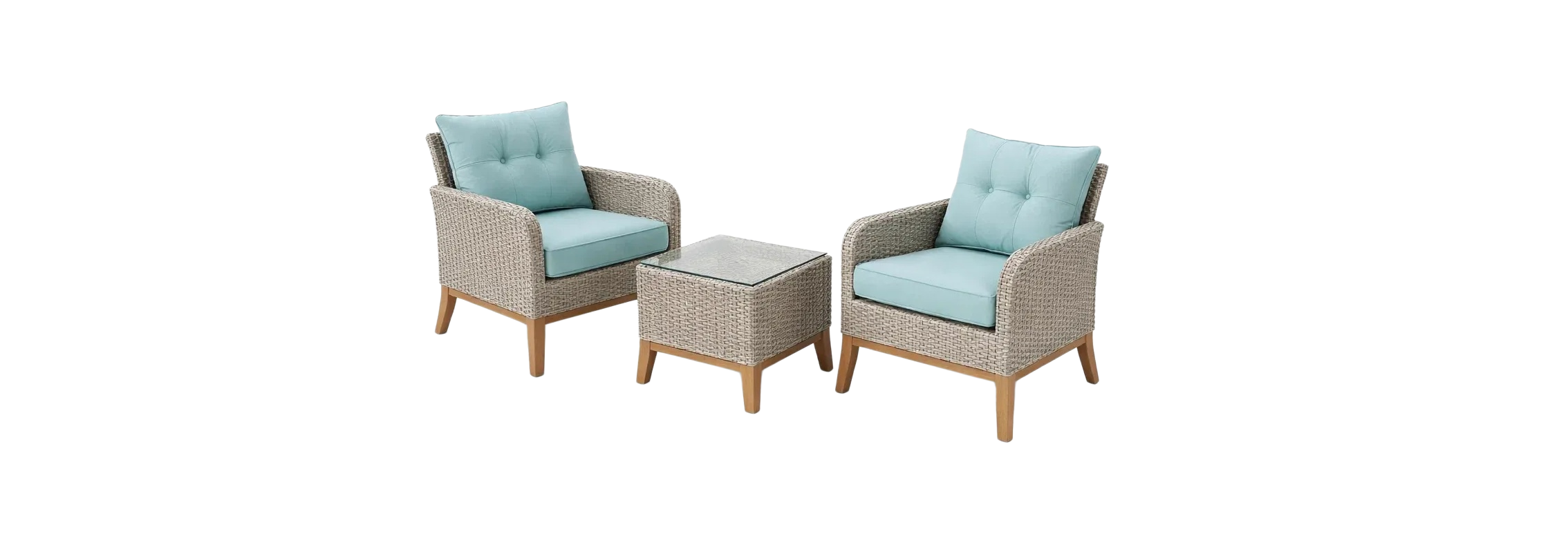 Set relax in rattan con cuscini azzurri e tavolino in vetro temperato